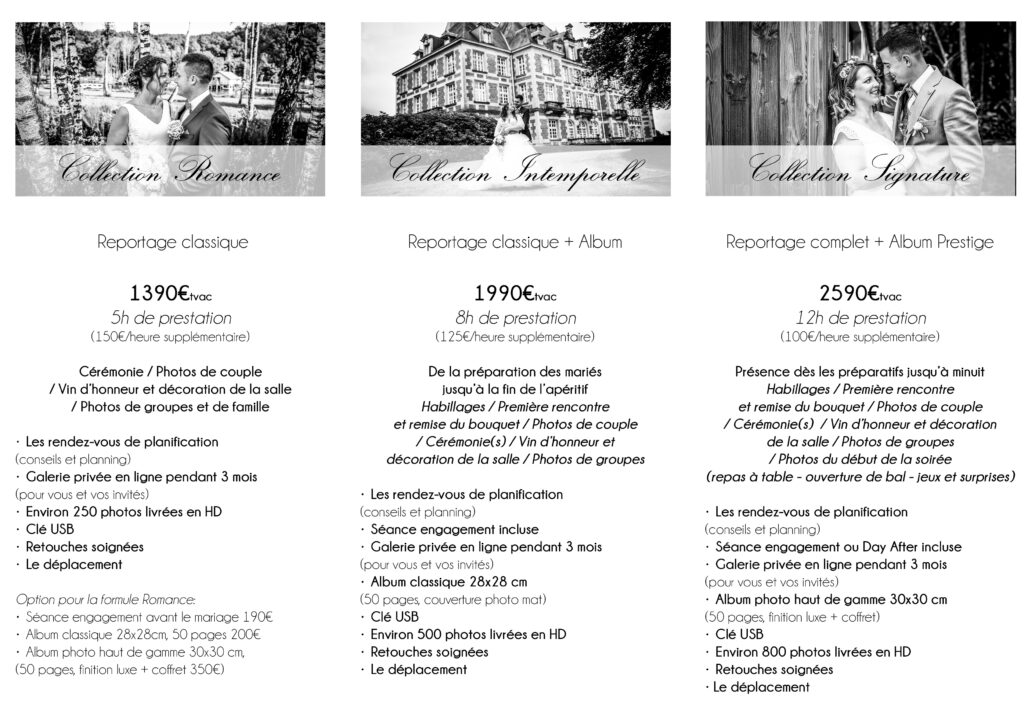 Prestation mariage à l’heure 250 € / heure Réservation à partir de 2 heures minimum, idéale pour une cérémonie civile ou un moment clé de votre journée. Vous pouvez aussi opter pour une collection plus complète: